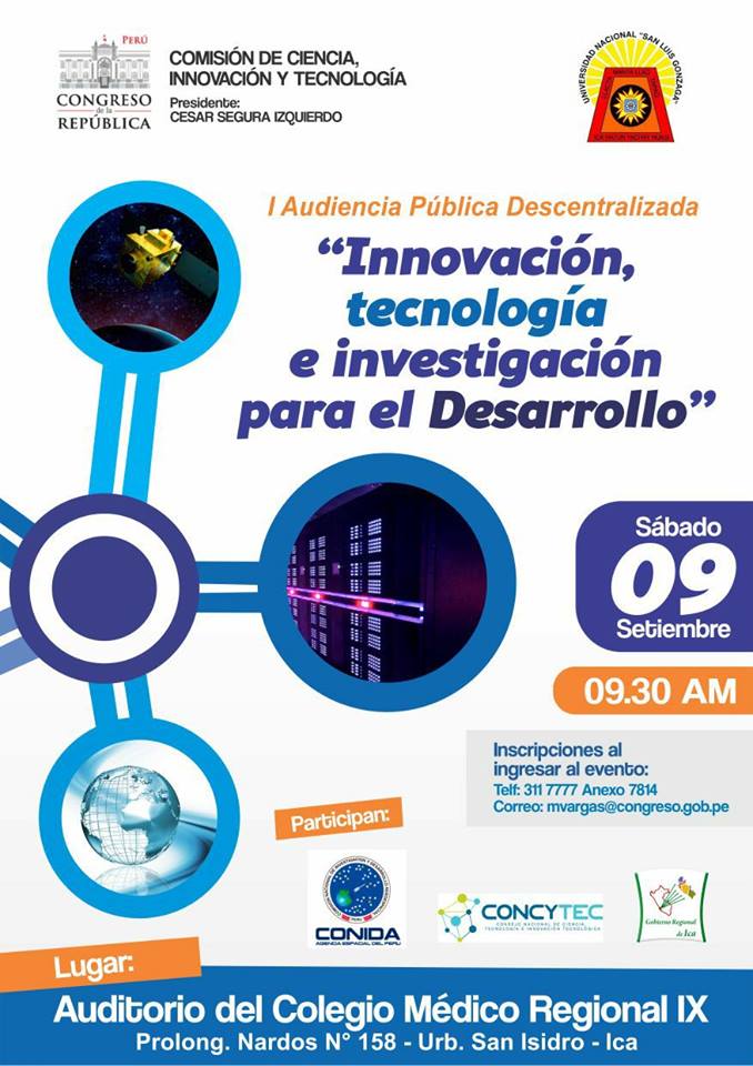 Primera Audiencia Pública Descentralizada "Innovación, tecnología e investigación para el desarrollo" en la ciudad de Ica, en coordinación con la Comisión de Ciencia, Innovación y Tecnología del Congreso de la República.